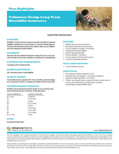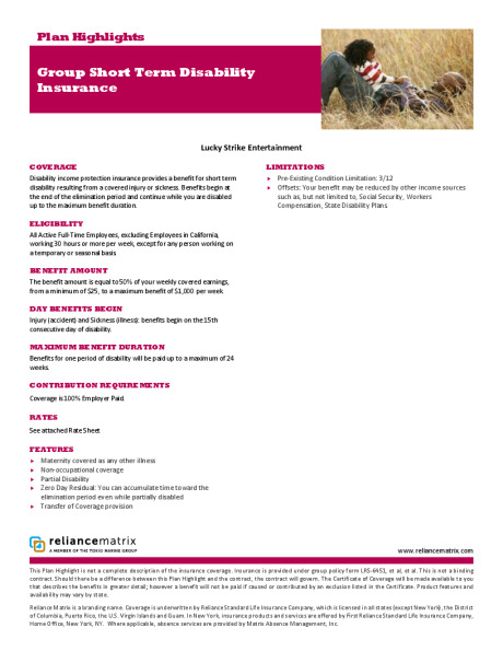 Short-Term and Long-Term Disability coverage is available for you through Reliance Matrix. The disability coverage is intended to provide you with income in the event you have an injury or illness that prevents you from being able to work.