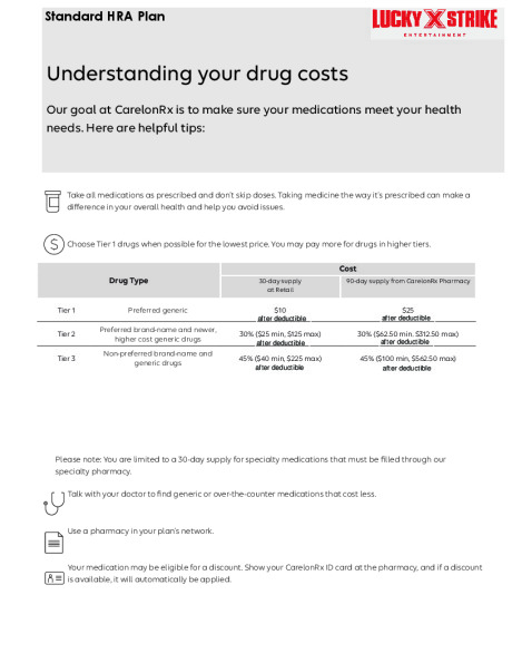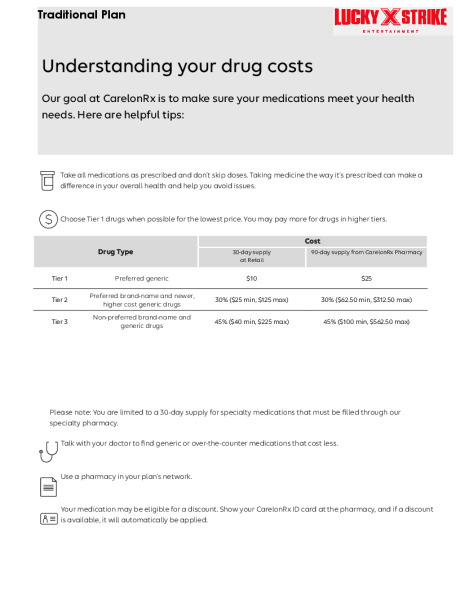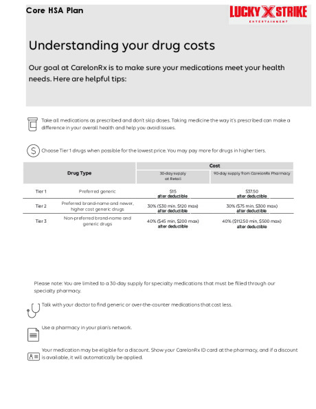 If you enroll in one of the Lucky Strike Entertainment’s medical plans, you will also have prescription drug coverage. CarelonRx is the prescription drug benefits manager. The prescription drug plan information will be printed on your UnitedHealthcare ID so you will not need a separate ID card.