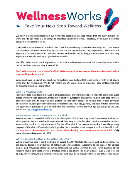 Lucky Strike Entertainment offers a $15 weekly medical premium discount ($780 annually) for associates who complete a Preventive Care Exam between May 1st and April 30th.